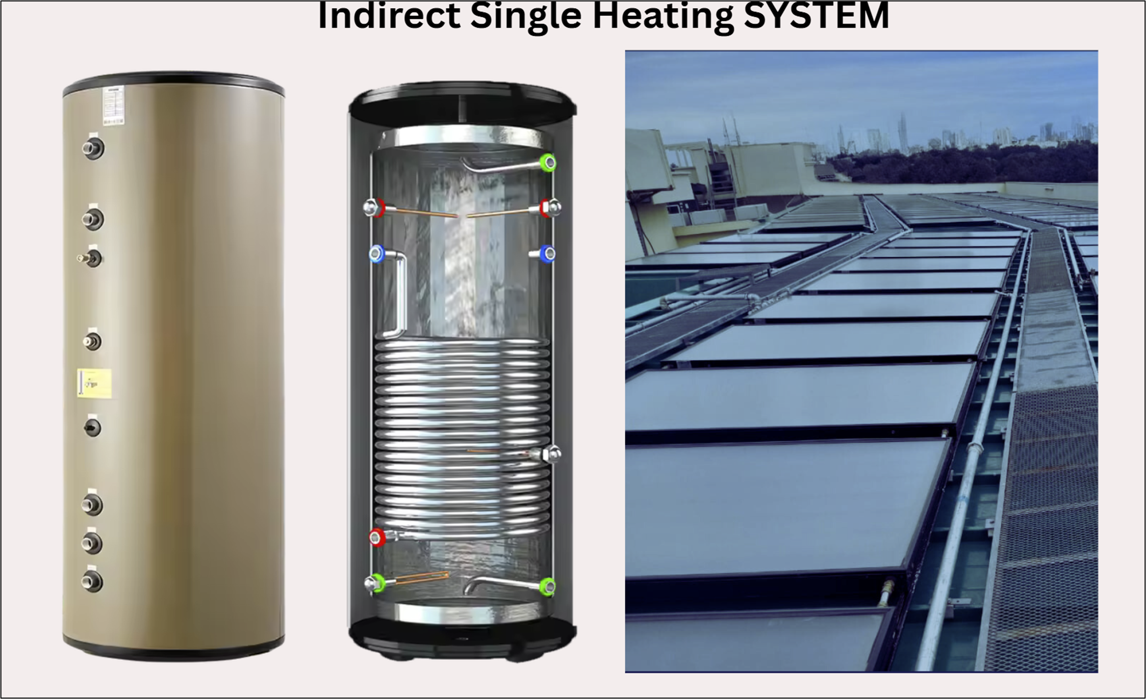A glycol-based heat transfer fluid circulates through the solar collectors via a high-efficiency pump. A smart temperature controller transfers heat to a built-in heat exchanger, heating domestic water indirectly for safe, hygienic use.